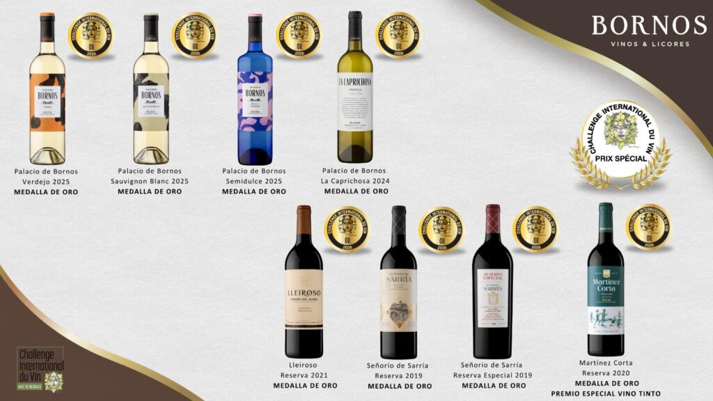 En la 50º edición de Challenge International du Vin celebrada en La Citadelle de Bourg – Francia, BORNOS Vinos & Licores ha conseguido 8 medallas de Oro y un Premios Especial a Mejor Vino Tinto. Challenge International du Vin es uno de los concursos de vinos y destilados más veteranos de Francia. En esta edición, reunió a 500 catadores de más de 20 países, que evaluaron 3000 muestras en catas a ciegas, bajo un sistema imparcial y riguroso.Las ocho medallas de oro han sido han estado repartidas entre 4 de nuestras bodegas. Palacio de Bornos (D.O. Rueda) ha obtenido medalla de oro en su Verdejo, Sauvignon Blanc, Semidulce y La Caprichosa. Señorío de Sarría (D.O. Navarra) ha sumado dos oros en su Reserva y Reserva Especial, y Lleiroso (D.O. Ribera del Duero) consolidó su posición con un oro en su Reserva.