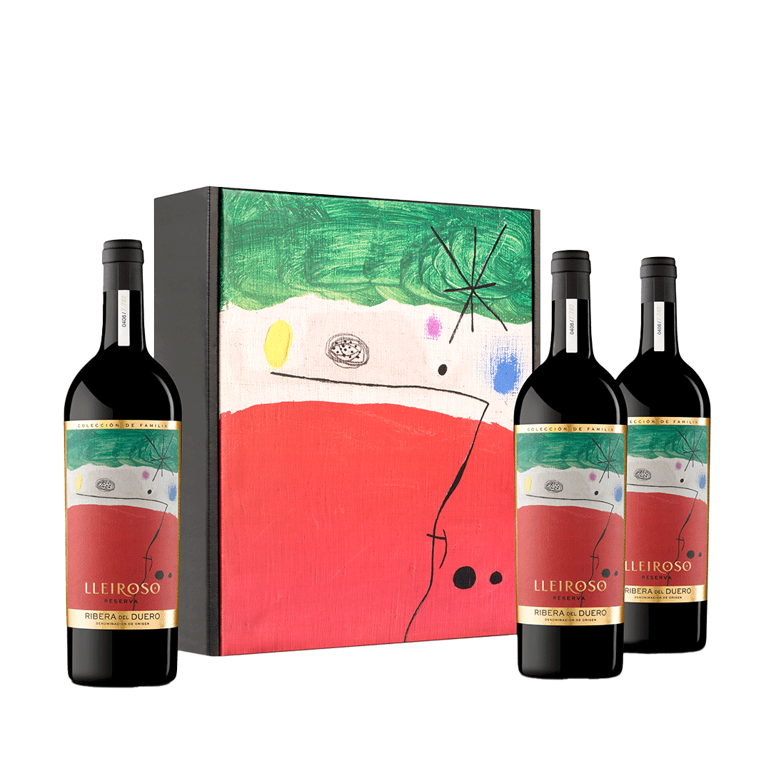 Lleiroso Colección de Familia Joan Miró, en estuche de 3 botellas. Brillante y luminoso. De color rojo picota con matices granates, de capa media/alta. Posee una gran complejidad aromática con un balance perfecto entre fruta y madera. Sabroso, noble y redondo.